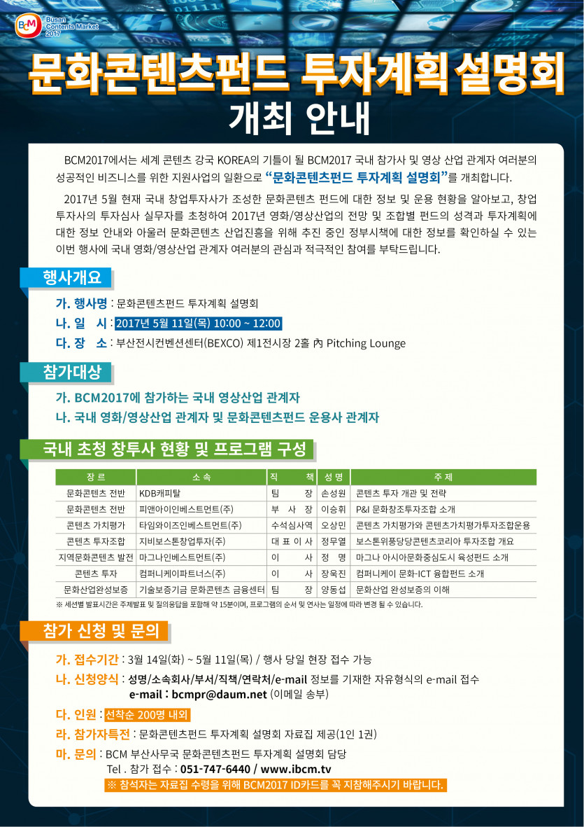 마. 문의 : BCM 부산사무국 문화콘텐츠펀드 투자계획 설명회 담당