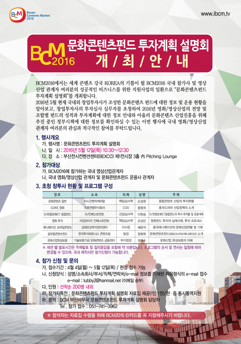 BCM2016 문화콘텐츠펀드 투자계획 설명회 개최안내