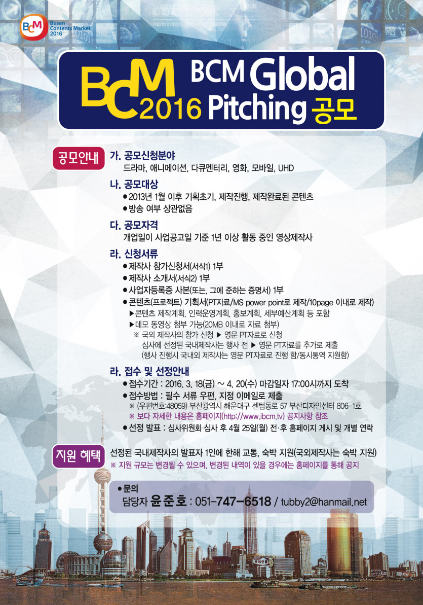 BCM Global Pitching 공모 페이지 정보 2016.03.17 2,739 views 본문 첨부파일 BCM Global Pitching 제작사 참가신청서.hwp (478.0K)